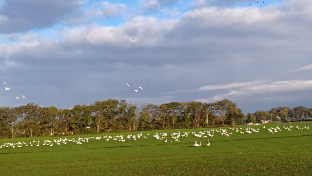 千歳市郊外の畑で多くの白鳥が羽を休めておりました。